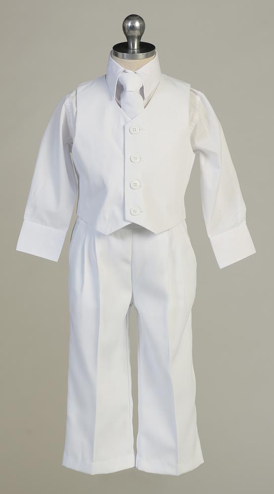 The perfect way to coordinate your son with that upcoming special event. This handsome 4 piece boys vest set comes as pictured. Set comes with clip on tie, long sleeve shirt, vest, and elastic waist pants. This is sure to be a closet staple. Vest set comes in many fashion colours including white, navy, charcoal gray, light gray, khaki, black.