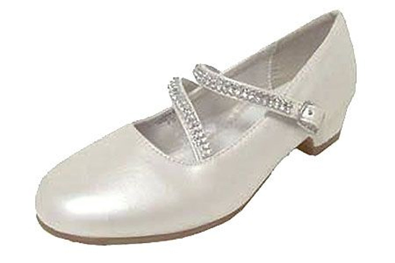Girls double diamond strap high heel shoe features a 1" heel with rhinestone strap that gives the shoes that extra pop that little girls love. A darling ivory dress shoe that’s simple and elegant. They are well priced and they are great in quality so that they can be worn from event to event. Girls diamond strap shoe is available in white, ivory, and black, man made materials.
