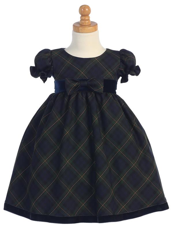 Classic plaid & velvet girls holiday dress will forever be in style. Plaid dress with velvet trim, short puff sleeve and a full plaid skirt that is fully lined. This darling little girls dress is perfect for holiday pictures. This dress has a matching boys vest set and 18" doll dress sold separately.